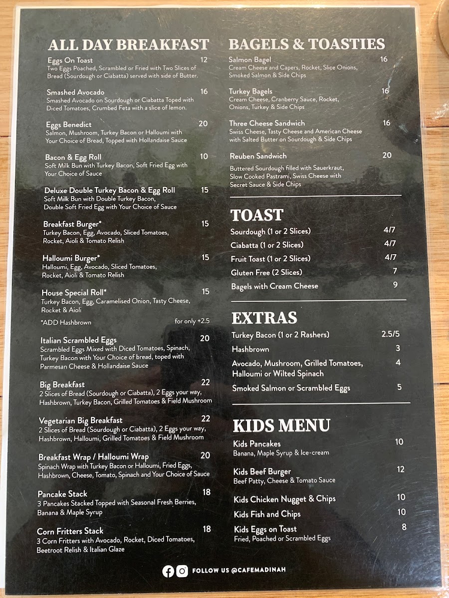 - Breakfast Dishes: Options like Eggs Benedict, Eggs on Toast, Big Breakfast, Vegetarian Big Breakfast, Pancake Stack, and Corn Fritters Stack.