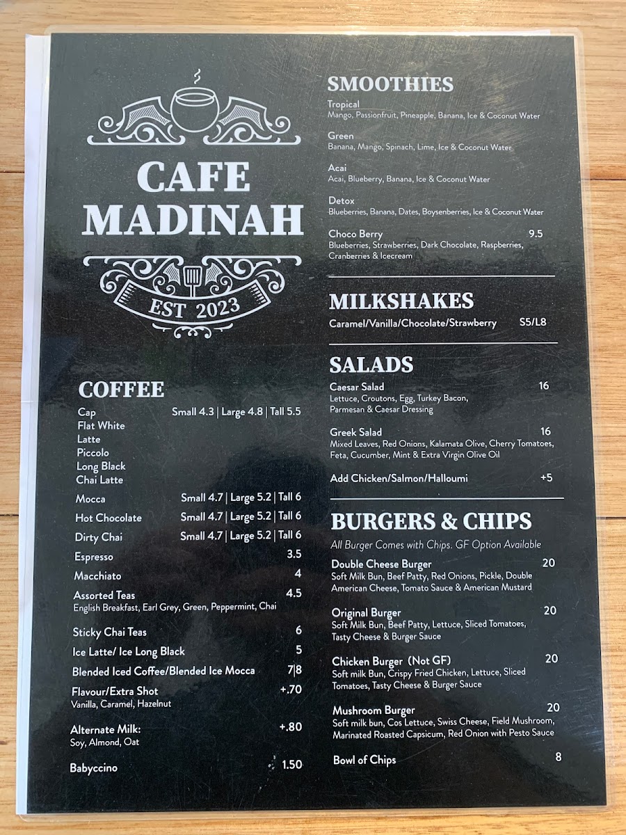 This menu is designed for customers seeking quick orders or casual dining, with a focus on breakfast and light meal offerings complemented by a variety of smoothies and coffee options available at the café.
